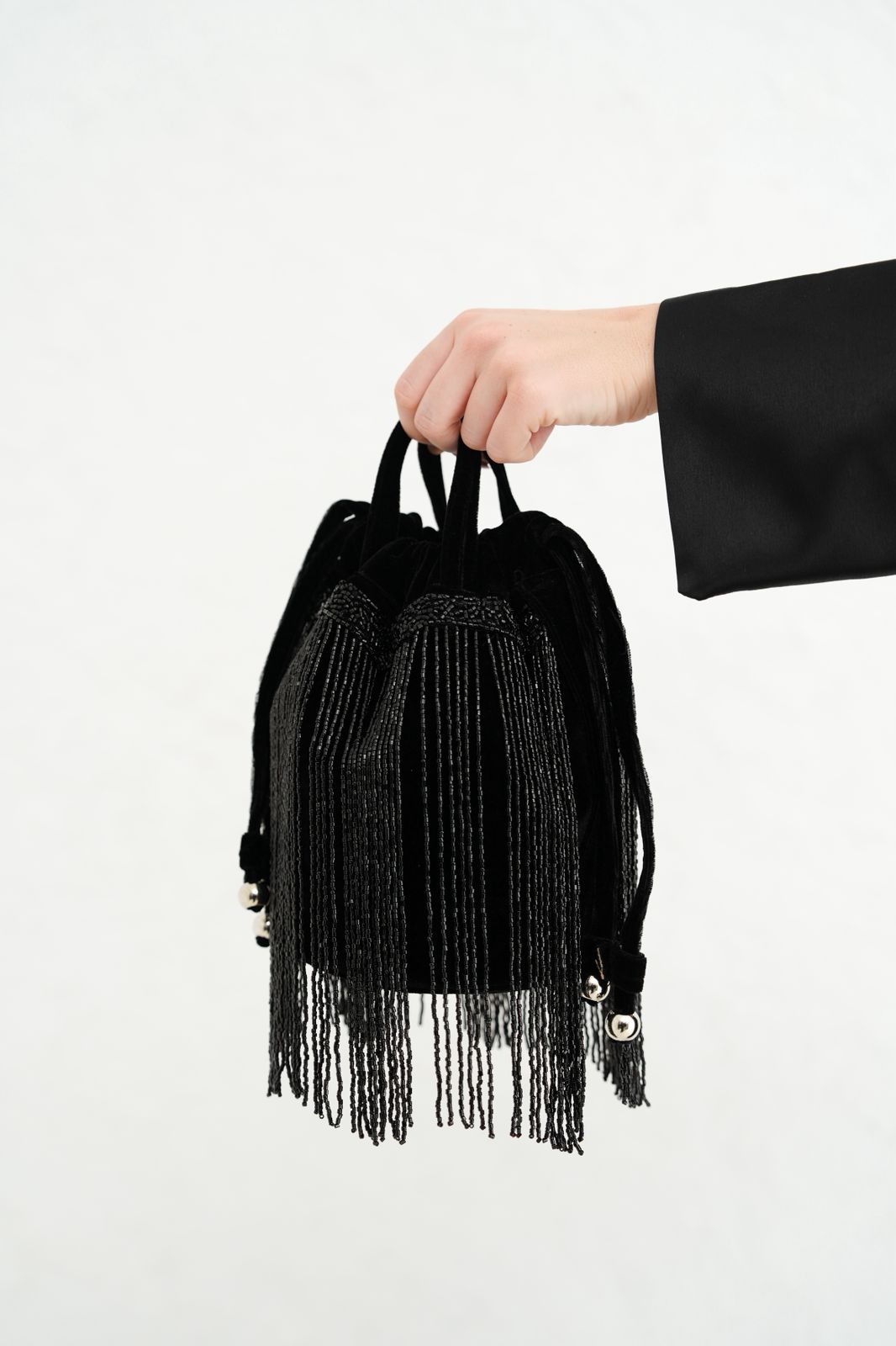 Crafted in plush black velvet with flowing fringe details, this mini bag embodies modern sophistication. A refined piece that adds movement, depth, and undeniable allure to any look.